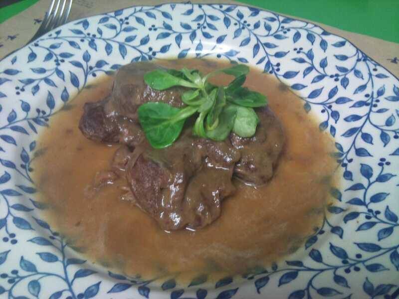 Hígado de pato con cebolla, manzana y salsa de pimientos
